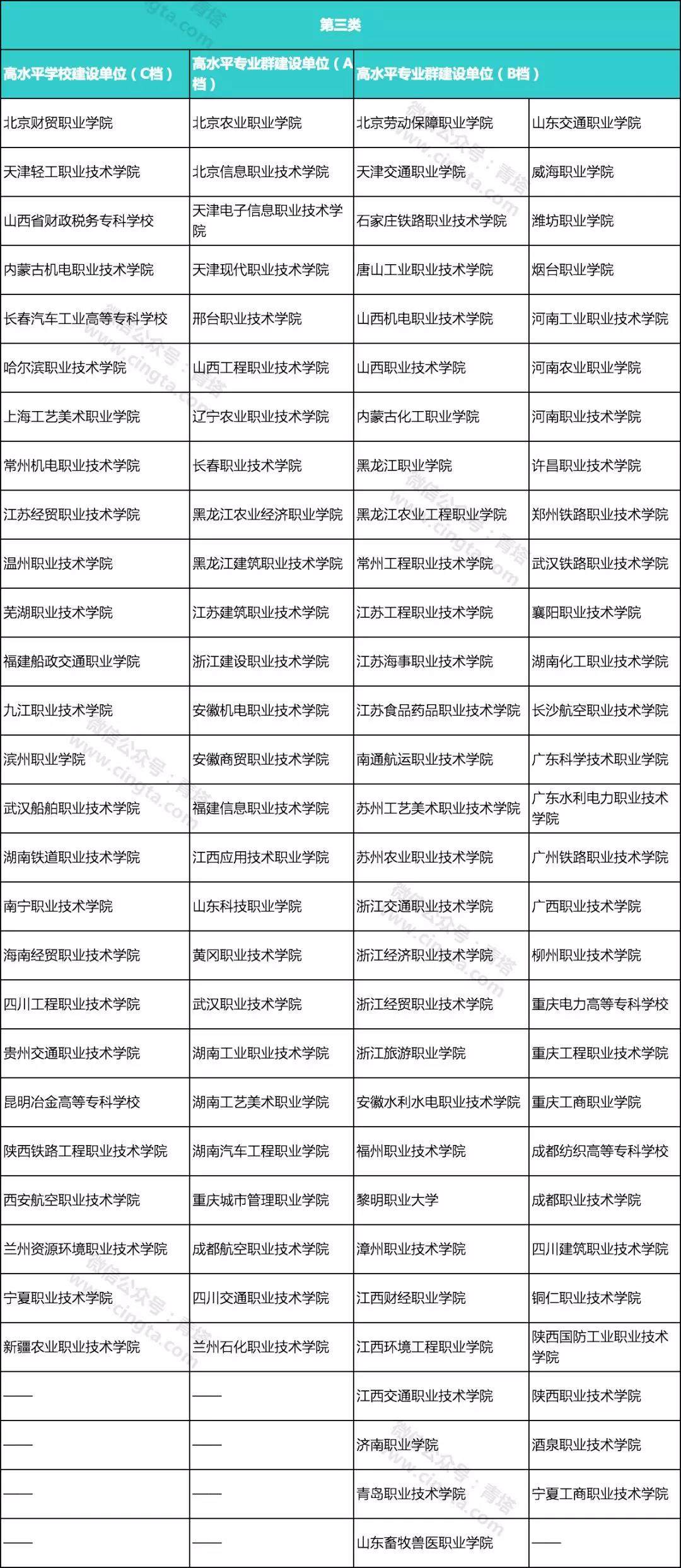 據悉,入圍“雙高計劃”的高職院校分為四類,其中類包括:高水平學校建設單位(A檔)10所;第二類包括:高水平學校建設單位(B檔)20所;第三類包括:高水平學校建設單位(C檔)26所、高水平專業群建設單位(A檔)26所、高水平專業群建設單位(B檔)59所;第四類包括高水平專業群建設單位(C檔)56所。